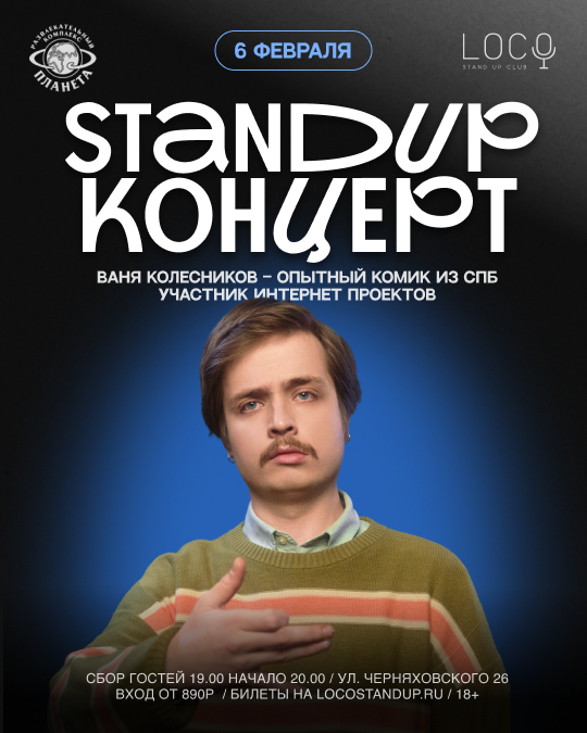 Ваня Колесников – опытный комик из Санкт-Петербурга. После абсурдного «Концерта в баре» (доступен на YouTube) Ваня выходит с новой программой. Его можно было увидеть в «VK Money Mic», «VK Open Mic» и в роли выходящего персонажа в «Большом шоу».