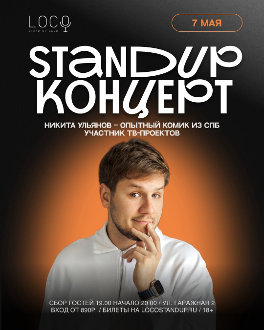 Никита Ульянов — стендап-комик и участник проектов «Comedy Баттл», «Stand Up Рулетка» на ТНТ, «Импровизация. Команды», Comedy Place и Comedy Petersburg’s.