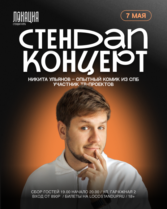 Никита Ульянов — стендап-комик и участник проектов «Comedy Баттл», «Stand Up Рулетка» на ТНТ, «Импровизация. Команды», Comedy Place и Comedy Petersburg’s.
